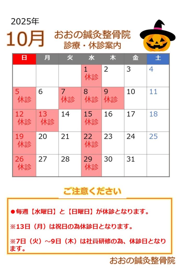 休診日のお知らせ 10月の休診日のお知らせ 2025年9月22日 2025年9月22日 おおの鍼灸整骨院スタッフ 10月の休診日の注意事項 毎週【水曜日】と【日曜日】が休診日となります。 ※13日(月)は祝日の為休診日となります。 ※7日(火)~9日(木)は社員研修の為、休診日となります。 よろしくお願いいたします。