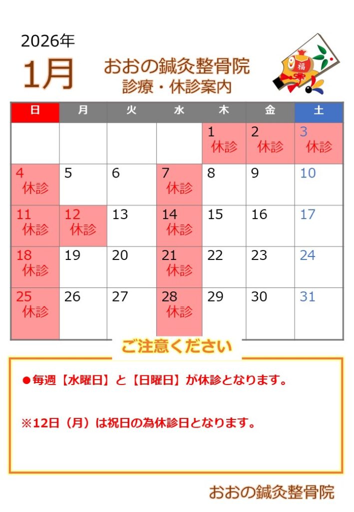 休診日のお知らせ 1月の休診日のお知らせ 2025年12月23日 2025年12月23日 おおの鍼灸整骨院スタッフ 1月の休診日の注意事項 毎週【水曜日】と【日曜日】が休診日となります。 ※12日(月)は祝日の為休診日となります。 よろしくお願いいたします。