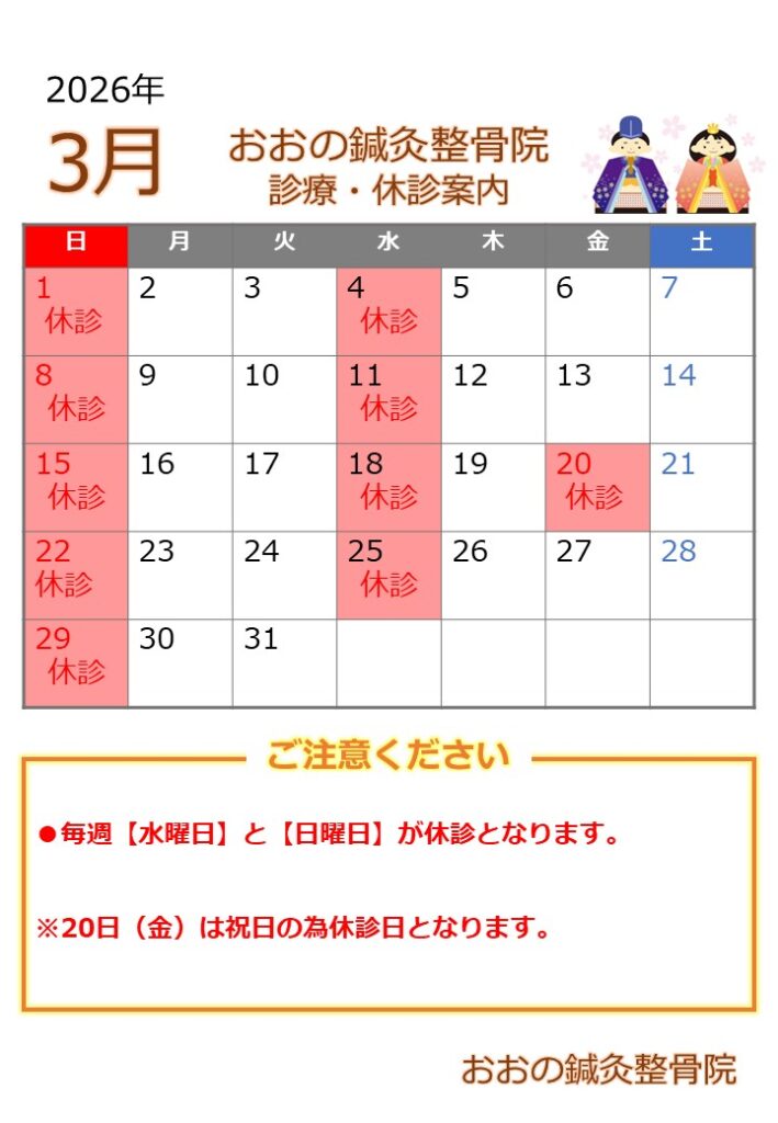 休診日のお知らせ 3月の休診日のお知らせ 2026年2月10日 2026年2月10日 おおの鍼灸整骨院スタッフ 3月の休診日の注意事項 毎週【水曜日】と【日曜日】が休診日となります。 ※20日(金)は祝日の為休診日となります。 よろしくお願いいたします。
