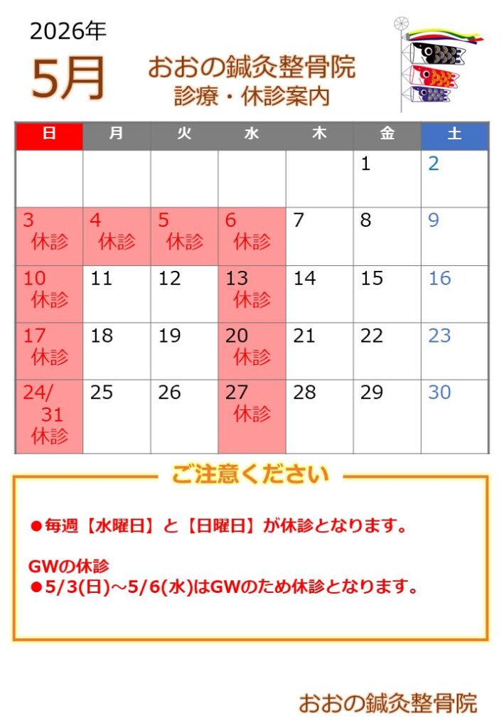 休診日のお知らせ 5月の休診日のお知らせ 2026年4月9日 2026年4月9日 おおの鍼灸整骨院スタッフ 5月の休診日の注意事項 毎週【水曜日】と【日曜日】が休診日となります。 ※5/3(日)~5/6(水)はGWのため休診となります。 よろしくお願いいたします。